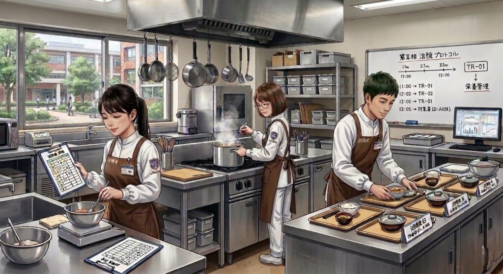 また、院内調理の施設では、管理栄養士と調理師が密接に連携し、個別の試験計画に合わせた食事の微調整が可能です。例えば、食事専門事業者が関わる場合、多くの食材を使い、治験方針に基づいて献立を作成する体制が整えられています 。しかし、厨房設備の維持管理費用や、調理師・栄養士の人件費、衛生管理基準の遵守など、多くの費用と手間がかかるのが課題です。